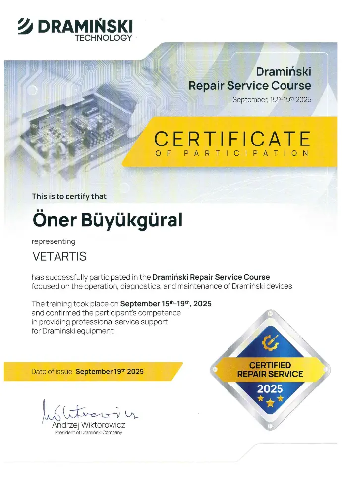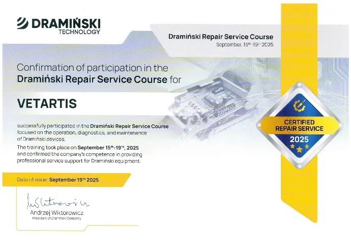 Wir bei VETARTIS sind durch die Teilnahme am DRAMINSKI Repair Service Course offiziell zertifiziert. Damit stellen wir sicher, dass wir Sie stets kompetent beraten und Ihnen einen qualifizierten Service rund um DRAMINSKI-Produkte bieten können.