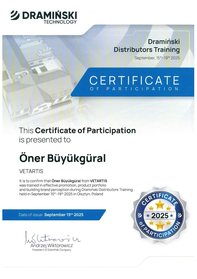 Durch die Teilnahme am DRAMINSKI Repair Service Course hat Herr Büyükgüral seine technischen Fähigkeiten in Wartung, Diagnose und Reparatur von DRAMINSKI-Geräten weiter ausgebaut.