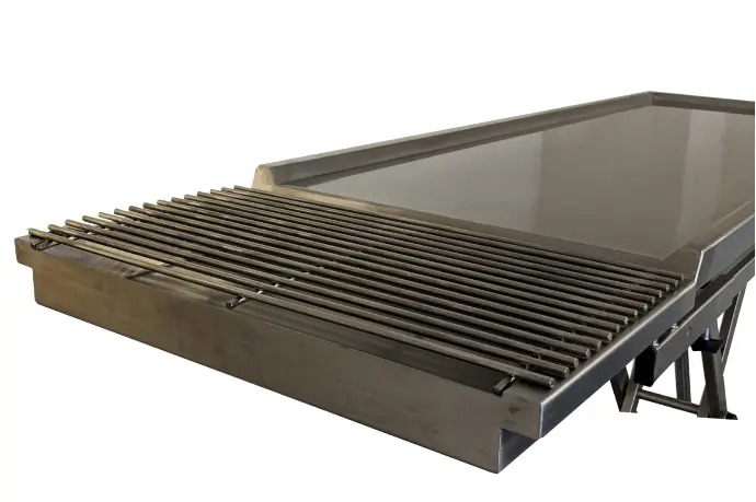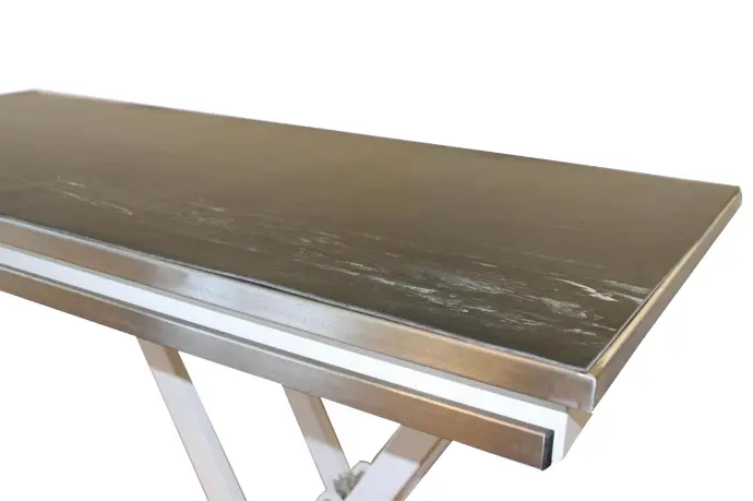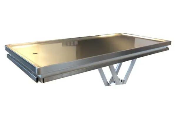 Die flache Arbeitsfläche aus Edelstahl hat standardmäßig die Maße 130 × 60 cm, kann jedoch auf Wunsch auch in einer kleineren Größe geliefert werden.